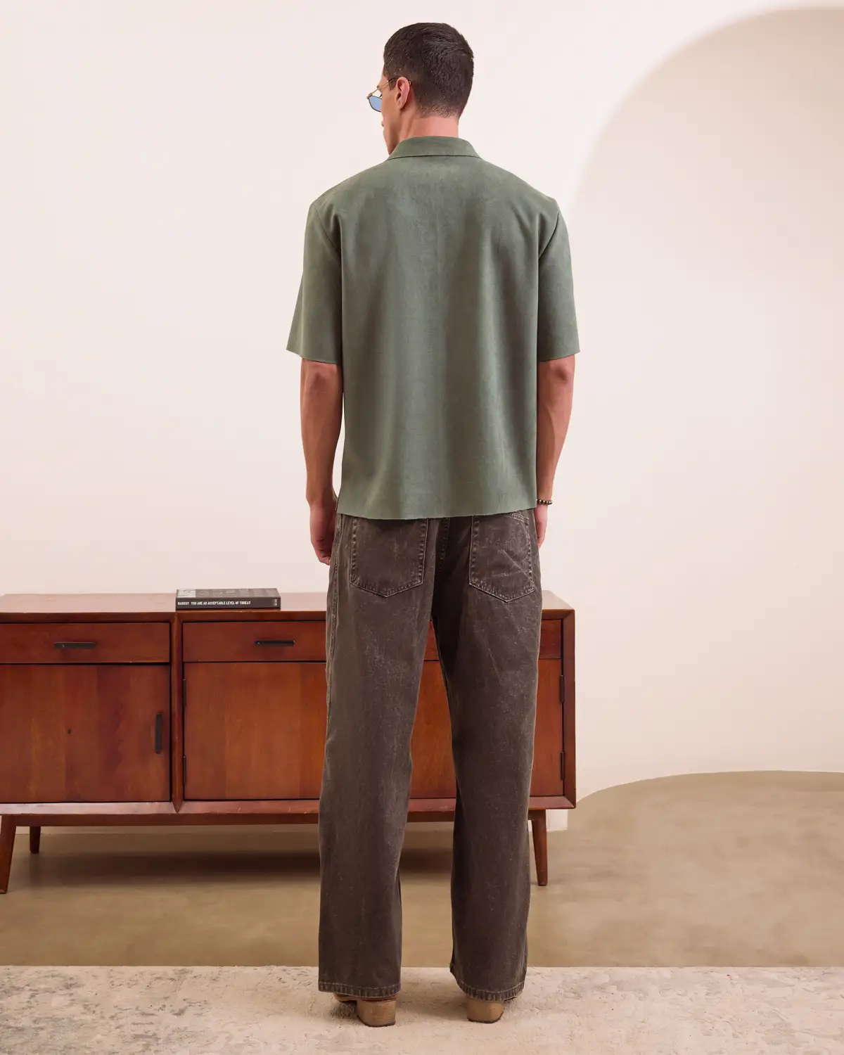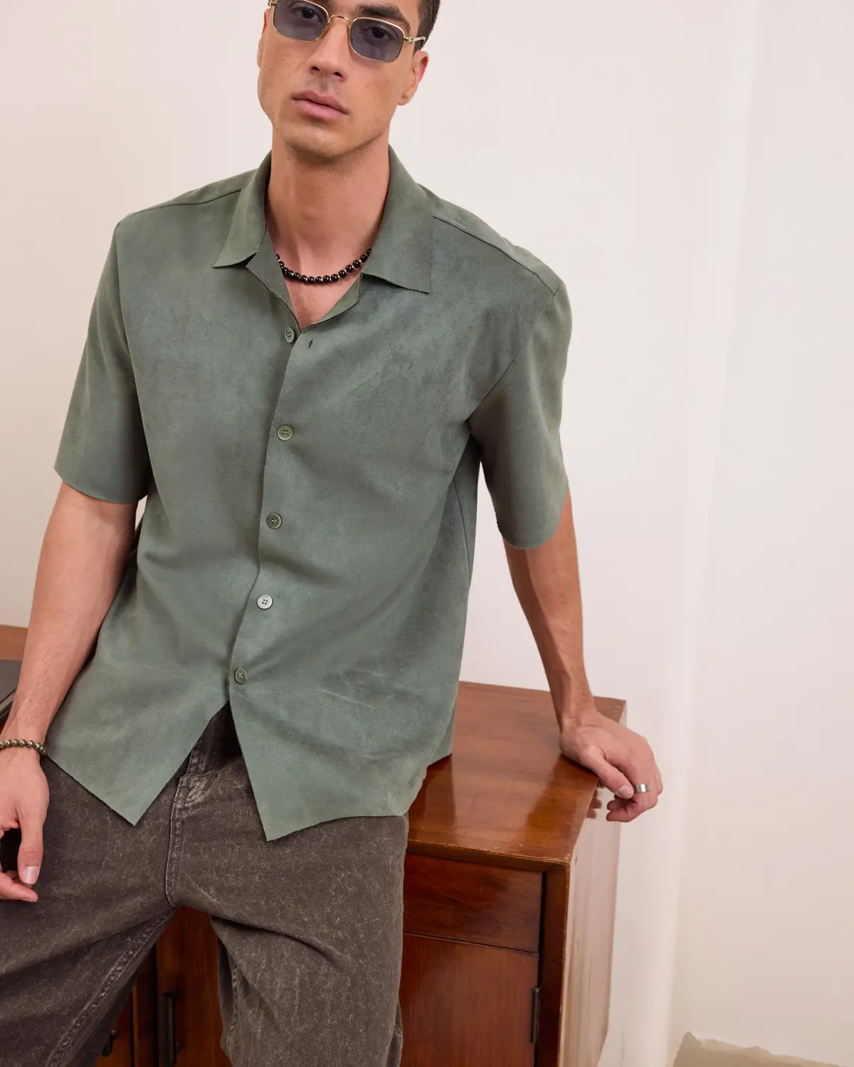 Short-sleeve shirt cut in a relaxed silhouette with an open collar and clean unstitched edges. Crafted in a heavy weight suede fabric with a soft, matte finish for an understated look and easy drape. Finished with a hand stitched chest patch pocket for that subtle statement.