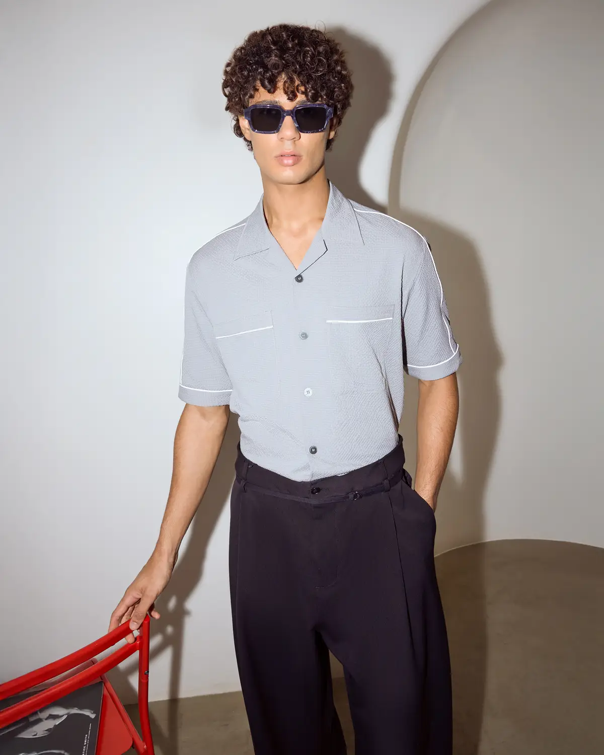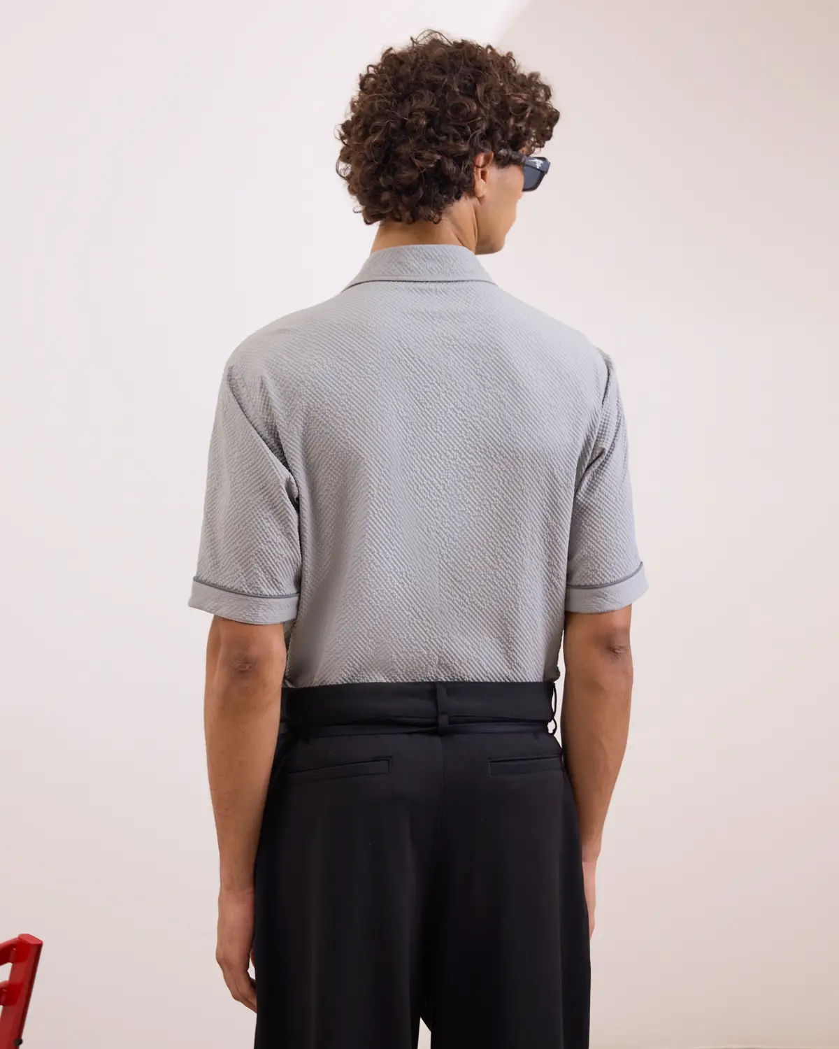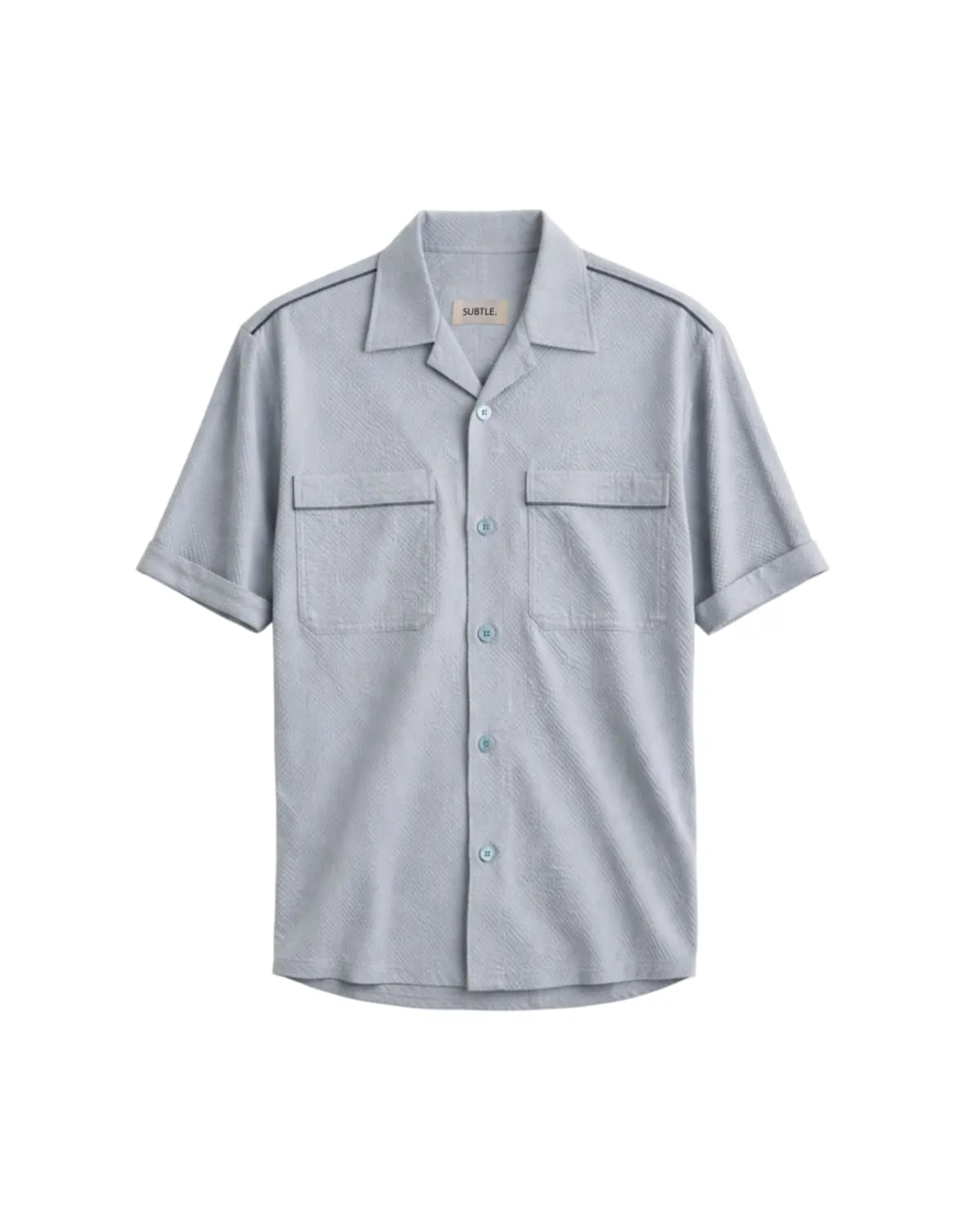 Short-sleeve shirt cut in a relaxed silhouette with a clean, open collar. Crafted in a lightly textured fabric with a subtle micro-pattern finish, designed to add depth without visual noise. Finished with reflective piping across the chest pockets and sleeves.